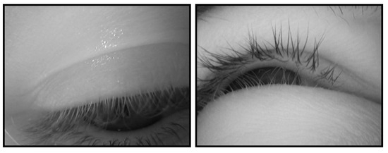 The eye-tracking software of video-based dark-pupil tracking systems identifies the pupil by searching for a round and dark part of the eye image. It is possible to capture a clear pupil image outdoors, but natural lighting introduces several challenges. Observers tend to squint in outdoor lighting, causing the lower eyelid and eyelashes to partially or fully occlude the pupil (Figure 12, left). When partially obstructed, the visible portion of the pupil is not round and is brightened by eyelashes, making it difficult for a search algorithm to detect. Additionally, even when overhead lighting is partially blocked by large-rimmed hats, ambient light can reflect off the cornea and may brighten the pupil (Figure 12, right).