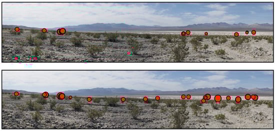 Effect of head motion compensation during horizontal scan. In this example, the same 5 seconds of an observer scanning the horizon is plotted without (top) and with (bottom) head motion compensation. Fixations are plotted as red dots and longer fixations are plotted with a larger dot size. Without head motion compensation, 13 fixations totaling 2069 ms of looking time were captured. With head motion compensation, 23 fixations totaling 4638 ms of looking time were captured.
