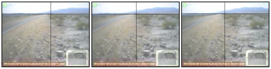Head motion compensation does not always increase the number of fixations that are detected. An example of this is seen in Figure 15: these frames were taken from an eye-tracking video as an observer slowly turned her head to the right (thus the landscape features are moving farther to the left in these images), while maintaining gaze on a single spot (as indicated by the gaze crosshairs).
