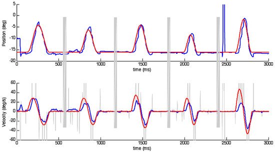 Examples of target (red) and eye (blue) responses represented as position (upper) and velocity (lower). Stimuli were presented as single cycle sinusoids with randomised peak velocity and frequency. Grey bands indicate randomised delay periods during which data was not collected. Grey spikes in velocity trace indicate saccades that have been removed to obtain smooth eye velocity after interpolation.