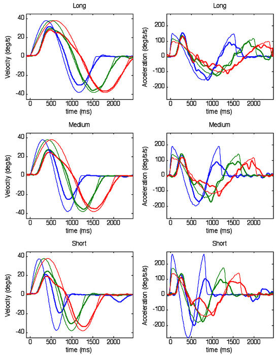 Velocity (left) and acceleration (right) of eye (thick traces) and target (thin traces) obtained after collation of all stimuli and responses into bins of common periodicity for each of the ranges of periodicity (Short, Medium and Long). Responses are averaged across all subjects and target velocities. For clarity, only three of the eight periodicity bins are shown; in each range, blue, green and red traces represent the 1st (i.e. highest frequency), 5th and 8th (i.e. lowest frequency) bins, respectively. Note particularly, the discontinuity in eye velocity and acceleration in red traces at mid-cycle.