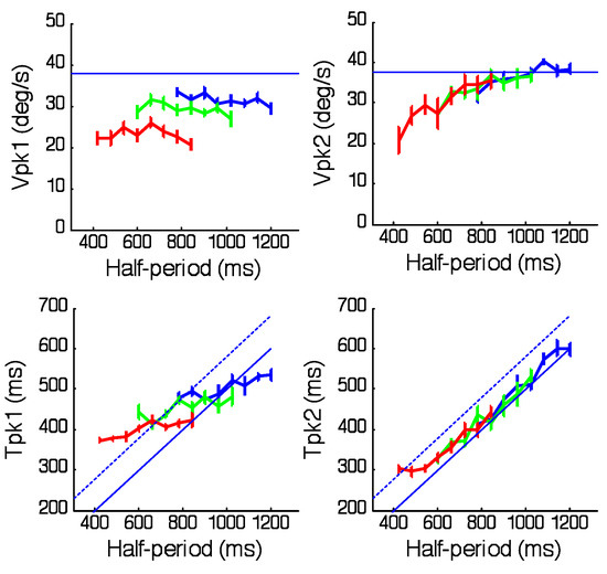 Effects of half-period duration on the magnitude (Vpk1,1st half-cycle; Vpk2,2nd half-cycle) and corresponding timing (Tpk1, Tpk2) of peak eye velocity in each of the 3 periodicity ranges; Short (red), Medium (green) and Long (blue) after averaging across target velocity. Mean of 6 subjects ± 1SEM. Solid blue lines indicate desired mean peak velocity (upper plots) or desired timing of peak velocity for zero phase error (lower plots). Broken lines show a time 80ms after desired peak.