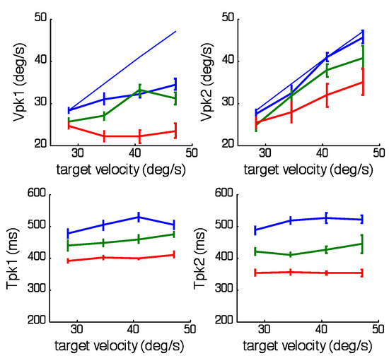 Effects of target velocity on the magnitude (Vpk1,1st half-cycle; Vpk2,2nd half-cycle) and corresponding timing (Tpk1, Tpk2) of peak eye velocity in each of the 3 periodicity ranges; Short (red), Medium (green) and Long (blue) after averaging across all half-periods within each range. Mean of 6 subjects ± 1SEM. Solid blue lines indicate desired mean peak velocity.