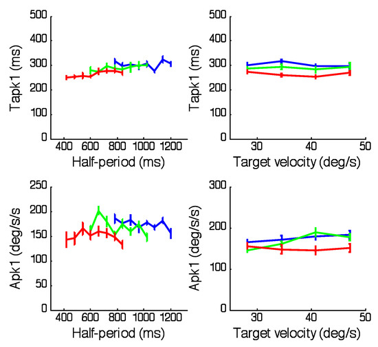 Magnitude (Apk1,1st half-cycle) and corresponding timing (Tapk1) of peak eye acceleration in each of the 3 periodicity ranges; Short (red), Medium (green) and Long (blue). In the left hand panels values have been averaged across target velocity, whereas on the right, they have been averaged across all half-periods within each range. Mean of 6 subjects ± 1SEM.