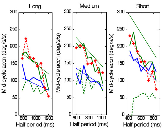 Eye acceleration 80ms after the end of the first halfcycle as a function of half-period for each of the 3 periodicity ranges (Short, Medium and Long). Thick blue and green traces represent values obtained for lowest and highest target velocities, respectively. Red trace represents catch trials at highest velocity. Thin blue and green lines indicate stimulus acceleration. Dashed green line indicates acceleration 80ms before end of first half-cycle for highest velocity. Mean of 6 subjects.
