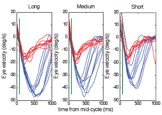 Comparison of eye velocity in the second half-cycle for the regular (blue) and catch (red) trials. Each trace represents the mean across all subjects for each of the half-periods within each periodicity range (Short, Medium and Long). The green vertical line indicates 80ms after mid-cycle.