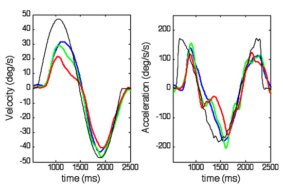 - Lisberger, S. G., C. Evinger, G. W. Johanson, and A. F. Fuchs. 1981. Relationship between eye acceleration and retinal image velocity during foveal smooth pursuit in man and monkey. Journal of Neurophysiology 46: 229–249. [Google Scholar] [CrossRef] [PubMed]