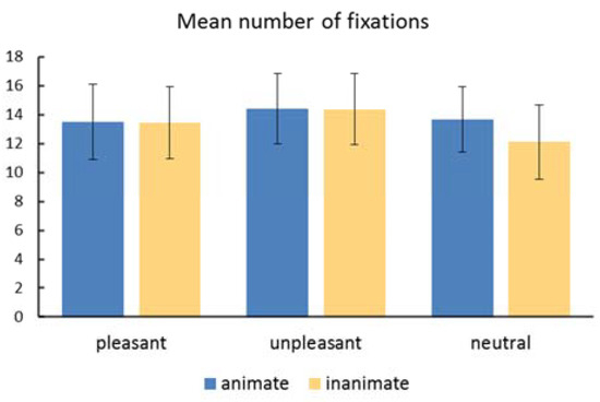 - Mean number of fixations for animate vs. inanimate pictures within each valence category. Vertical bars indicate standard deviations.