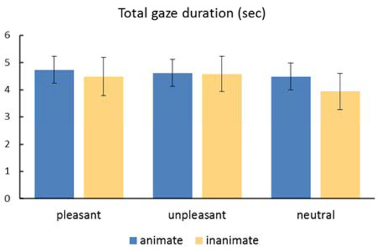 Total gaze duration - The histogram in Figure 3 compares the total gaze duration for animate vs. inanimate pictures within each valence category.