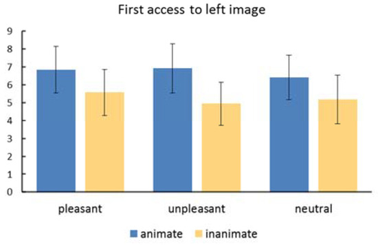 Post-hoc comparisons showed that the first access on animate left images was significantly higher compared to inanimate ones, t(64) > 4.55, p < .001, and the first access on pleasant images was higher compared to neutral ones (p< .05) (Figure 4).