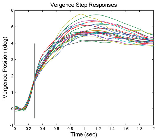 Vergence responses were computed as the difference between separately calibrated left and right eye movements using the calibration data taken before and after each response. A typical ensemble of vergence movements was shown in