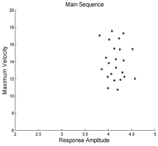 Figure 3 shows the main sequence that results from this response ensemble. There is no linearly dependent relationship between peak velocity and amplitude. Rather, a variation in peak velocities is seen along with a variation in response amplitudes, but there is no apparent relationship between the two: the ratio between these two dynamic descriptors is random.