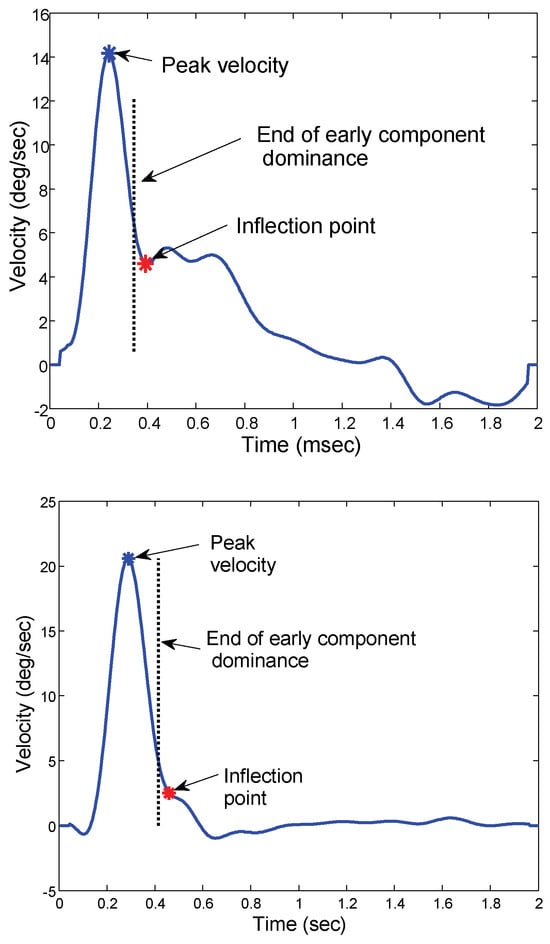 Isolating the early component from the total vergence response is the most challenging aspect of this study. While methods have been developed using independent component analysis to separate the initial and sustained components, they operate on a group, or ensemble of movements and identify component averages across the group (Semmlow and Yuan 2002; Semmlow and Yuan 2002; Semmlow et al. 2007). Here we need to identify the segment dominated by the early response in individual eye movements. Fortunately, the identification of this segment need only be approximate; slight variations will have little effect on the result. As independent component analysis has shown that the early component is much faster than the sustained component (Semmlow and Yuan 2002; Semmlow and Yuan 2002; Castillo et al. 2006; Alvarez et al. 2007; Semmlow et al. 2007), we can safely assume that the early component dominates the vergence step response up through and beyond the time of peak velocity (Alvarez et al. 1999). We also assume that when the sustained component becomes significant, it will alter the velocity profile of the overall response due to the influences of visual and internal feedback. Therefore, to isolate the early component, we examine the velocity trace and search for an inflection which marks the onset of a substantial additional component.