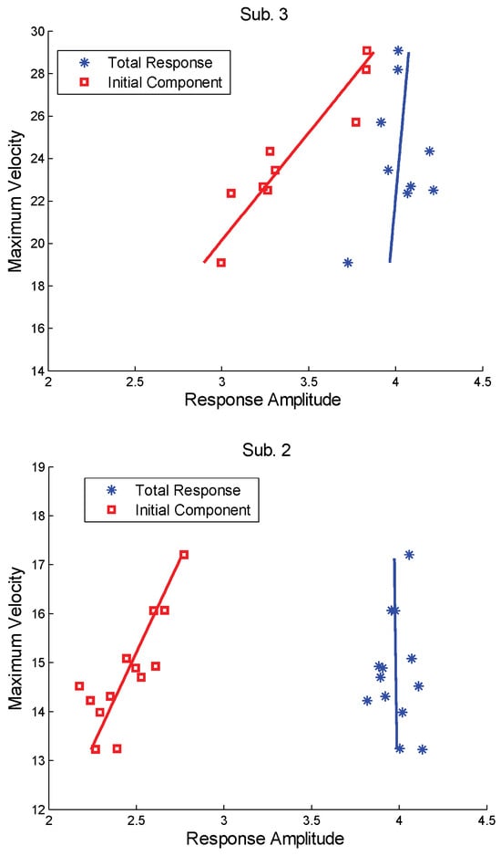 Figure 6 were determined using velocity as the dependent variable (Either variable could be used as the dependent variable and would lead to the same interpretation with regard to linear dependencies. However, since the main sequence of the overall response is usually near vertical, taking velocity as the dependent variable produces a vertical regression line that is more visually informative.). The main sequence linear dependency can be quantified by the regression coefficient of determination (