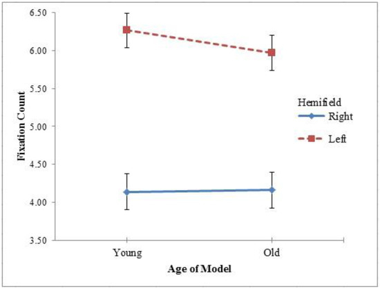 Age of Model x Hemifield interaction effect for fixation count measurement (Bars represent Standard Errors).