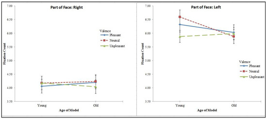 As a result of mixed ANOVA for fixation count, the main effect of age of the model (F(1, 38) = 6.86, p < .013, η² = .153), emotional face expression (F(2,78) = 3.22, p < .046, η² = .08) and hemifield of face (F(1, 38) = 26.12, p < .001, η² = .41) were found to be significant for fixation count, while the main effect of observer gender was not significant. Interaction effect of observer’s gender and hemifield of face (F(1, 38) = 4.89, p < .033, η² = .11) and the interaction effect of age of the model and hemifield of face (F(1, 38)= 8.98, p < .005, η² = .19) were found to be significant (see Figure 4 for interaction effect graph). Lastly, the three-way interaction among age of the model, emotional face expression, and hemifield of face (F(2, 76) = 4.98, p < .009, η² = .12) were found to be significant. The interaction effect graph is presented in Figure 5.