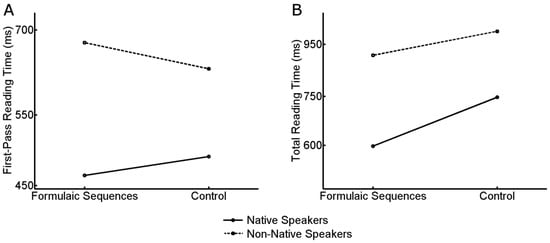 The first-pass reading time in both groups as a function of Group and Condition is depicted in Figure 1a. Native speakers read the sequences much faster and they tended to do so particularly in the case of formulaic sequences (the difference between the conditions is larger by 88 ms in native speakers as compared to non-native speakers), although this interaction did not turn out significant (see Table 4), indicating that our analysis of first-pass reading times was quite underpowered.