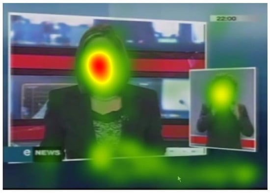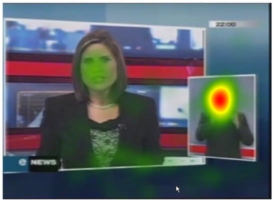 Figure 2 illustrates that hearing participants looked mainly at the main picture but also looked at the text and interpreter AOIs. This is also reflected in their mean fixation durations (Hear Mfd(interpreter) = 0.417s, SD = 0.381s; Hear Mfd(picture) = 0.403; SD = 0.216s; Hear Mfd(text) = 0.277s, SD = 0.136s). If a close-up shot of a human was present (as in Figure 2), hearing participants focused on the face. They were also sensitive to minor changes in the logo or time displays. Their fixations tended to be short and their gaze plots characterised by movement between all areas of interest, demonstrating that the hearing participants monitored all information sources.