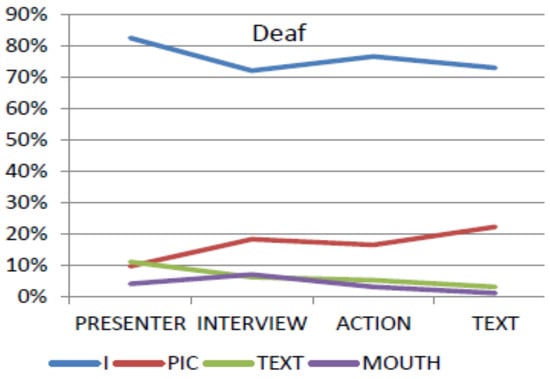For both groups, fixations on the picture increased as pictorial information density increased, with consequent decrease of fixations on other areas of interest. The results also revealed that Deaf participants look at interviewees more than at presenters. Secondly, Deaf participants seldom fixated on mouths except for interview scenes, whereas hearing participants do. In fact, hearing participant mouth fixations on non-speaking human figures in action scenes are similar to those of Deaf participants for interview scenes. Thirdly, for both groups, textual fixations are the highest for human subjects, i.e. the interviewee or presenter, and decrease as pictorial content increases. Although hearing participants consistently accessed text more than Deaf participants across all scene types, both groups relegated text to a tertiary information source.