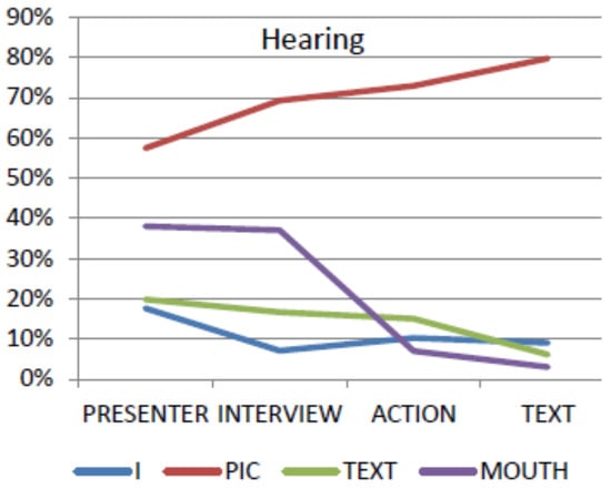 In contrast, the hearing participants spent most of their viewing time looking at the picture, but also constantly monitored all information sources, seldom fixating long on a single object. Similarly to the Deaf participants, hearing pictorial fixations increased with increasing pictorial information density at the expense of other information sources. Moreover, pictorial fixations also increased with lack of comprehension of a programme language, with hearing participants showing particular increased visual attention to newsreaders when the language is not comprehended. On the other hand, reading text and lip-reading are only utilised as tertiary information sources. Notwithstanding, hearing participants utilised them more than did the Deaf participants, although these differences were not always significant.