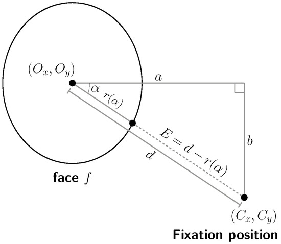 Eccentricity: is the relative distance from a participant’s fixation on screen to the edge of nearest face ellipse in degrees. In Figure 3, (d − r(α)) is eccentricity E of face ellipse with origin (Ox, Oy) from fixation position (Cx, Cy).