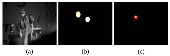 Figure 5. From left to right (a) the input frame with faces, (b) the face map Mf for the input frame with 2DGaussianed faces from the ground truth, and (c) the frame’s corresponding fixation Gaussianed for one participant (σ = 0.5°), referred to as Mh.
