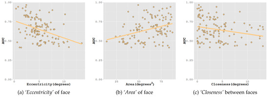 AUC scores averaged across subjects for video snippets with one face (166 in total) are shown as a function of eccentricity and area in Figure 8. We observe that performance of faces decreased with increasing eccentricity; that is, faces presented in the foveal region of the current fixation tend to attract gaze compared to faces presented in the peripheral region in a quite linear way. In contrast, the performance of faces increased with increasing surface area. Faces with larger surface areas attract more gaze compared to ones with smaller surface areas.