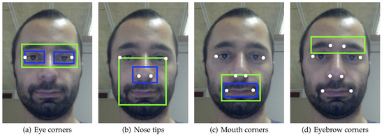 After the eye corners are selected, we search the nose in a square region below them. When the Haar cascade returns a valid detection—as in the inner rectangle in Figure 2(b)—, the two nasal points are selected at fixed locations inside this area. The algorithm continues in a similar way for the mouth and eyebrow feature points.
