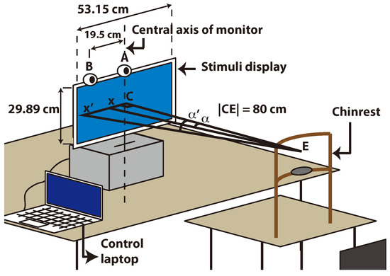 The stimuli display faces the subject and it is raised by a support which enables the subject to face the center of the display directly. The camera is placed at the top of this display at the center (A), and it has an alternative location which is 19.5 cm towards the left from the central location (B). An optional chinrest is placed at the specific distance of 80 cm away from the display, acting as a stabilizing factor for one of the experiments.