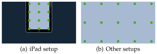 - iPad setup: This setup is used to test the performance of our system simulating the layout of an iPad on the stimuli display. This background image contains an iPad image where the iPad screen corresponds to the active area in the experiment and is shown in a different color (see Figure 5(a)). The distance of the subject is decreased to 40 cm, in order to simulate the use-case of an actual iPad. The camera stays in the central position; and it is tilted down as seen necessary in order to center the subject’s face in the camera image.