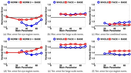 Lastly, Figure 6(c) and 6(f) show the results when the eye-region normalization is combined with wholeimage or face-region normalizations. As the eye-region normalization is independent of the others, the parameters for this step are fixed to the best performing values (µnorm = 127, σnorm = 50) and the black baseline shows the best results achieved with only eye normalization (1.22° horizontal, 1.36° vertical errors).