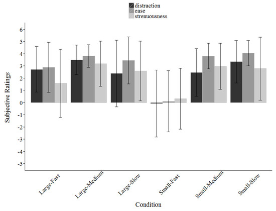 As displayed in Figure 3, the mean rating for the medium speed condition and the large distances between the moving targets was comparatively high regarding the three criteria ease, strenuousness and distraction. Ease was rated with an average of M = 3.81 (SD = 0.93), strenuousness with a mean of M = 3.18 (SD = 1.86) and distraction with an average of M = 3.49 (SD = 1.21).