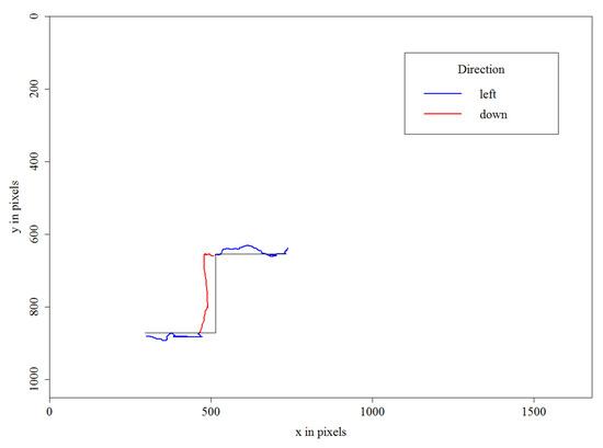 In order to set up an interactive system we aimed to develop an easy to implement and robust algorithm to map the observed eye gaze behavior to the movements of the PIN pad buttons. For the development of such an interaction we used the medium speed/large distance eye- tracking raw data collected during the first experiment. Each data sample provides information about the gaze position on the display (Point Of Regard—POR) and is defined by x/y coordinates. As we sampled at 60 Hz and a single movement in one direction took one second, a single pursuit is represented by approximately 60 data points. An exemplary gaze track consisting of three single pursuits is shown below in Figure 4.