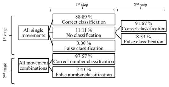 Classification Rate. With the algorithm applied, a total of 99.07% of all single eye movements and accordingly 97.57% of all numbers were correctly identified on first input (Figure 5, Table 4). The remaining 2.43% of numbers needed repeated input. In total, no false number or PIN was selected. The first classification step identified 88.89% of the single movements correctly. No single movement was classified incorrectly in this first step. 11.11% of the single movements were not identified and therefore referred to the second step, which classified 91.67% of the remaining strokes correctly.