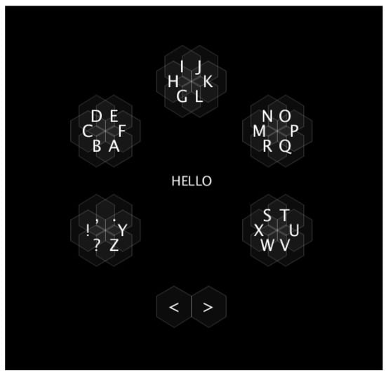 Similar to the layout of the EEG (Electroencephalography, the measurement of electrical activity in different parts of the brain)-based Hex-O-Spell (), a hexagonal layout with hexagonal tiles is used. This approach is supported by a study on smooth pursuit-based interaction, where the detection rate of four and six objects was similar, but dropped when presenting more than six objects (). We use six interactive objects in two interaction stages: Six clusters of characters, each consisting of at most six character tiles (see Figure 1). Each cluster comprises six neighboring letters of the alphabet, respectively the letters Y, Z and special characters. Within each cluster, the first and last character of the cluster appear closest to the center of the screen. By looking at these two closest tiles, the user can determine the range of characters covered by the cluster.