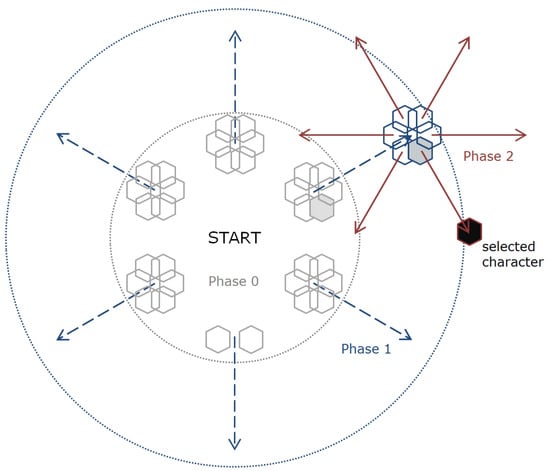 Phase 2 represents the second stage of movement, where individual tiles move away from each other. Only character tiles of the selected cluster are explicitly visible. After 200 ms subtle visual feedback (slightly higher saturation of the tile) is presented continuously to indicate which character tile would be selected according to the currently detected gaze path. At the end of Phase 2, a character is selected if the user’s gaze path matches the movement path of a character tile. The tiles of other character clusters move as well, but are presented as barely visible tile shadows not showing characters to provide a dynamic impression without distracting the user.