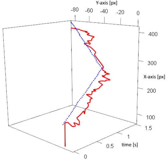 Exemplary stimulus movement (blue, dotted) and gaze path (red) over time.
