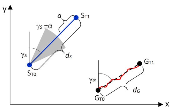 Our algorithm is based on the vectors between start and end positions of both stimulus and smooth pursuit movements. On the screen, the stimulus moves from position ST0 to ST1. The stimulus vector is defined by its angle γS and distance dS. The gaze vector is calculated using the gaze positions GT0 and GT1 detected at the beginning and end of the stimulus movement, and defined by γG and dG, accordingly. These parameters are shown in Figure 4, a hypothetical gaze path is drawn in red colour, the corresponding gaze vector as a dashed line. By comparing stimulus and gaze vectors, the classification is performed independent of absolute positions. It is based on an angular criterion allowing an angular error ±α and a distance criterion allowing a distance error a, which are defined in advance. Classification is successful if the detected gaze vector is within these criteria. Therefore, equations 2 and 3 have to be met.