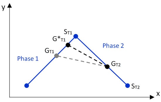 For Phase 1 (the user is following a cluster of characters), this approach works fine as the stimulus movement is started by an eye movement in the same direction. Phase 2 starts based on a point in time, namely when Phase 1 is finished and a valid pursuit movement was detected. For the detection of the second smooth pursuit movement, the system delay has to be considered. To compensate for artefacts arising from that delay, the algorithm for detecting the second movement has been adapted as follows. Instead of using the detected gaze position at the beginning of movement GT1, a sample recorded after 200 ms delay () is used. By compensating for system latency, the angular error is reduced (compare Figure 5). On the other hand, the distance error increases as the calculated distance will decrease as a result of the geometrical relations. This can be compensated by defining more liberal distance criteria. The possible tolerance of the angular criterion is limited to ± 30 ° maximum to avoid overlap between movements. The distance criterion though can be set liberal, as long as it is above zero. Including these considerations, we used α = 29 ° and a = 0.8 dS as parameters for experimentation.
