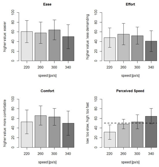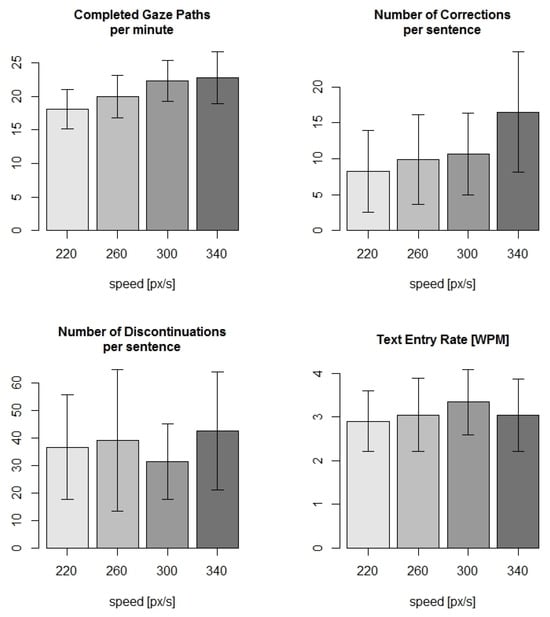 Object movement speed was varied over four different speed conditions (200, 260, 300, 340 px/s) in a within-subjects design. The slowest speed level corresponds to the smooth pursuit pace rated most pleasant in the study of (). The other speed levels increase by 40 px/s (approx. 1 ◦ visual angle per second) each to maximize text entry rate. In order to balance training effects, the sequence of speed conditions was fully randomised. Effects on the performance measures words per minute, number of completed gaze paths per minute, number of corrections per sentence and number of discontinuations per sentence were studied. The number of discontinuations is the amount of cases where a pursuit movement was aborted and the user’s gaze returned to the central area. We formulated the following hypotheses regarding the performance measures: We postulated that the number of completed gaze paths per minute as well as the number of corrections and discontinuations per sentence rise with increasing object movement speed. The combination of these effects leads to the assumption that at higher speeds, the benefit of an increased number of gaze paths per minute is mitigated by higher error rates originating from more corrections and discontinuations. Supplementary to performance data, subjective data was acquired by asking participants to rate ease, effort and comfort of pursuing characters with the eyes. Rating was conducted using a semantic differential. In an electronic questionnaire, participants set a mark on an unmarked line between two semantic poles, resulting in a value between zero and 100. Additionally, we asked for feedback on the perceived character movement speed between the poles too slow and too fast, where the optimal speed corresponds to a value of 50.