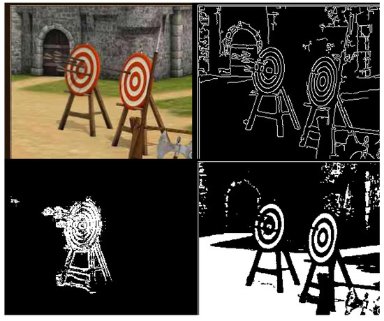 The figure shows the saliency analysis of one single frame from an animated advert: original advert (top-left), edge pixels (top-right), motion pixels (bottom-left), and luminance pixels (bottom-right). The number of white pixels in each sub-image constitutes the respective values for the saliency measures on this frame.