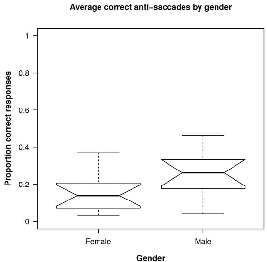 The overall results on anti-saccade accuracy and anti-saccade latency were expected, but a more interesting result of the anti-saccade test appeared when we looked at correct responses by gender. These results revealed that, in the current sample, boys seem to have a significantly higher success rate than girls. The average proportion of correct responses in girls was 0.16, and 0.27 in boys (see Figure 2). This difference was significant (p≤0.05). This result is somewhat surprising since girls are generally assumed to have an earlier cognitive development at this age, which would supposedly facilitate correct responses in the anti-saccade test compared to boys (Patterson, 2008). Because of this difference, we decided to add an interaction between gender and oculomotor control to the regression model (see further discussion below).