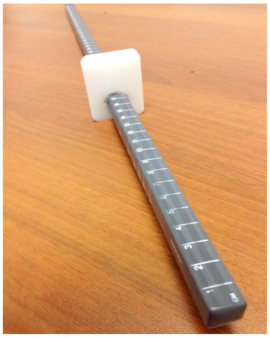 Using a near point rule (Figure 1), the NPC was measured for all subjects using three different sized letters (8, 11, and 14 pt font) in reduced Snellen chart format, a pen tip, and a black line. The target was moved towards the subjects nose at a slow pace of about 1-2 cm/s. The break point, or point at which diplopia was experienced or ocular alignment was lost, was recorded. All subjects were simply instructed to alert to examiner as to when the target became not just blurry, but double in appearance. Each target was tested twice and all trials were randomized. Statistical analysis was performed using a repeated measures analysis of variance (ANOVA), which was followed up using paired samples t-tests.