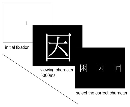 When the experiment began, the participants moved a mouse pointer to a cross sign at the center of the screen to ensure that it was the fixation point of the participants each time. The fixation point disappeared when the mouse pointer reached the cross sign, and the Chinese character appeared immediately for 5 s. The computer displayed the experimental characters at random and performed drift correction after displaying seven characters to ensure that the participants could clearly identify the characters. After displaying each experiment character, the system displayed three characters of similar form for the participants to confirm the experiment character. The procedure is shown in Figure 3.
