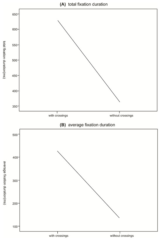 Total fixation duration and average fixation duration of characters with and without crossings.
