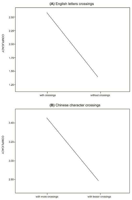 English letter crossings and complicacy ANOVA: The effect of structure characteristics on complicacy (F1,340 = 136.320, p < 0.01, η2 = .805) was significant, as shown in Figure 8. This result suggested that the number of crossings in English letters affected the subjective complicacy of the participants, and identifying English letters consisting of a high number of crossings was more complicated for the participants.