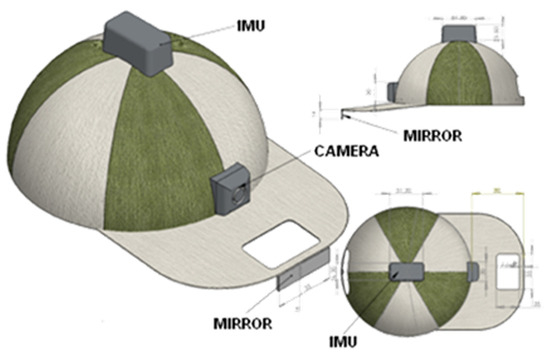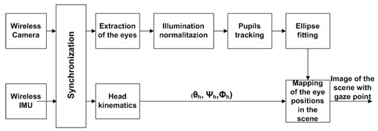The HAT-Move eye tracking system was developed in two configurations: the “baseball” hat (see Figure 1) and the head band (see Figure 2). They are technically and functionally equivalent, although the former can be considered aesthetically more pleasant. It is comprised of a wireless camera that is light and small, with an Audio/Video (A/V) transmitter of up to 30m of distance. The camera has a resolution of 628 × 586 pixels with F2.0, D45° optic, and 25 frames per second (f.p.s.). In addition, the InfraRed (IR) filter, which is actually present in each camera, was removed and a wide-angle-lens was added allowing to enlarge the view angle and acquire natural infrared components increasing both the image resolution and the contrast between pupil and iris. This system is able to simultaneously record the visual scene in front of the subject and eye position. This is achieved through a mirror(5 x 0.6 cm) placed in front of the user’s head (see Figure 2). The system is completely customizable on the user’s forehead (see Figure 2). In addition, a wireless Inertial Motion Unit is placed atop the head close to the azimuth rotation center (see Figure 3). The IMU allows for the acquisition of head movements and rotations during natural activities, allowing for the correction of eye gaze estimation taking into account both the movements during the calibration phase and the “Vestibulo-Ocular Reflex” (VOR) contributions. The adopted IMU provides the three rotation Euler-angles of the head (see Figure 3) with a sampling frequency of 100 Hz. The system is intended to be wearable, minimally invasive, capable of eye tracking, estimating pupil size, lightweight, and equipped for wireless communication. Moreover the system is designed to be attractive and aesthetic (in a baseball-like version), and able to process the eyegaze pattern in real-time. The HAT-Move system uses a passive approach for capturing ambient light reflected by the eye (VOG). The customized image acquisition system is able to acquire both natural light along with its IR components that are already present in the natural light bandwidth. Therefore, the system presents IR lightning advantages increasing the pupil-iris contrast and avoiding any possible eye injury due to artificial IR illuminators. The block diagram in Figure 4 shows the methodology used to process the acquired image, in which both eyes and scene are presented. The whole processing chain is comprised of a series of algorithms for the detection of the eye center and for the integration of the head rotation angles and the correction of involuntary head movements. Specifically, the eye center detection is achieved through the following steps: eye region extraction algorithm, photometric normalization algorithm of illumination, extraction of the pupil contour, and ellipse fitting algorithm as well. Afterwards, the center of the eye is detected, Eulero-head-angles together with the pupil center are integrated into the mapping function to map the eye center and movements into the image plane. The processing chain is fully described in the following sections.