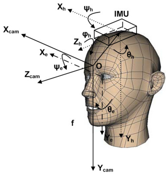 Representation of the head along with IMU. In the figure Xe, Ye are the axis in the reference frame of the eye; Xcam, Ycam, Zcam are the axis in the reference frame of the camera; Xh, Yh, Zh are the axis in the reference frame of the center of the head where the IMU is placed; ψh, θh, ϕh are the Euler-angles of the head rotation while ψe, θe, are the Euler-angles of the eye rotation.