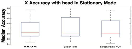 Box plot of data from the statistical comparison of the Median and Median Absolute Dispersion (MAD) along with x axis, with and without head movements. In the case of head movements with VOR correction.