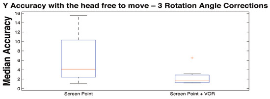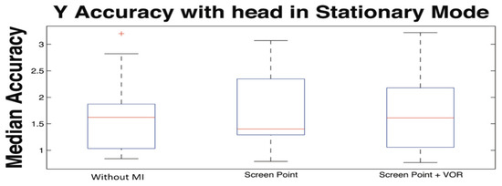 where dpixel represents the distance between the subject and the calibration plane. Table 2 and Table 3 show median and median absolute dispersion of errors per subject, expressed in degrees, in stationary head condition for x and y axes (similar information are shown from the Figure 16 and Figure 17). In particular, the first column refers to the values without any correction, the column Screen Point is referred to the error values, in the image plane, with the correction of the calibration plane orientation only actuated by IMU, and the column Screen Point + VOR is referred to the values, in the image plane, with the MI of both calibration plane orientation and VOR together. The corrections are reported for three head rotation angles θ, ϕ, and ψ.